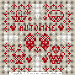 As every sundaymorning I looked this morning at Broderienet to see what is the freebie of the week. This week it is "Automne" which means "autumn" in french. It measures 7.8 x 7.8 cm when it is stitched on 35 count linen. So sweet these little baskets. Have fun!
